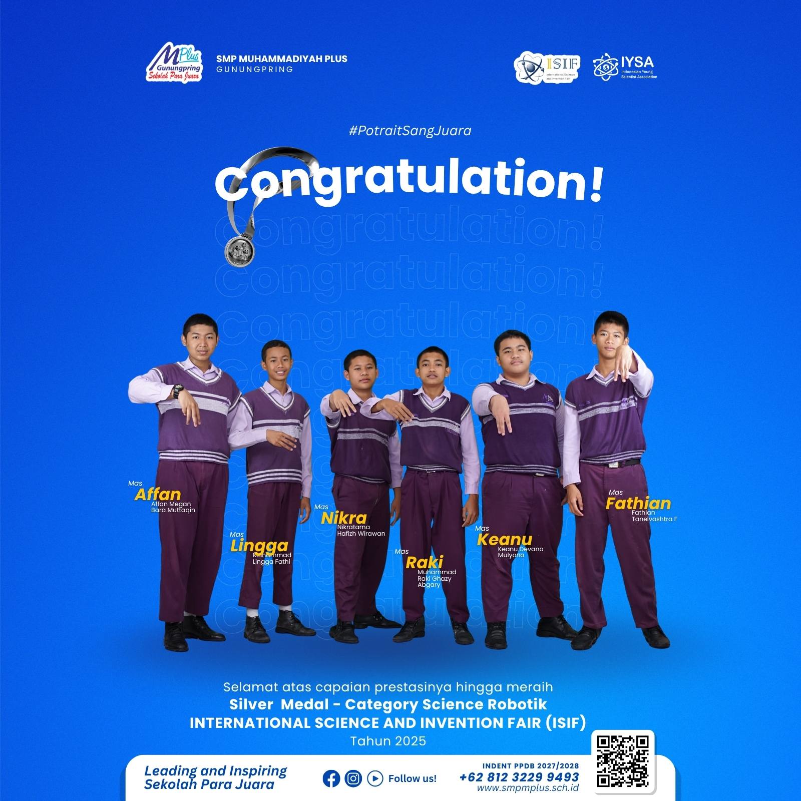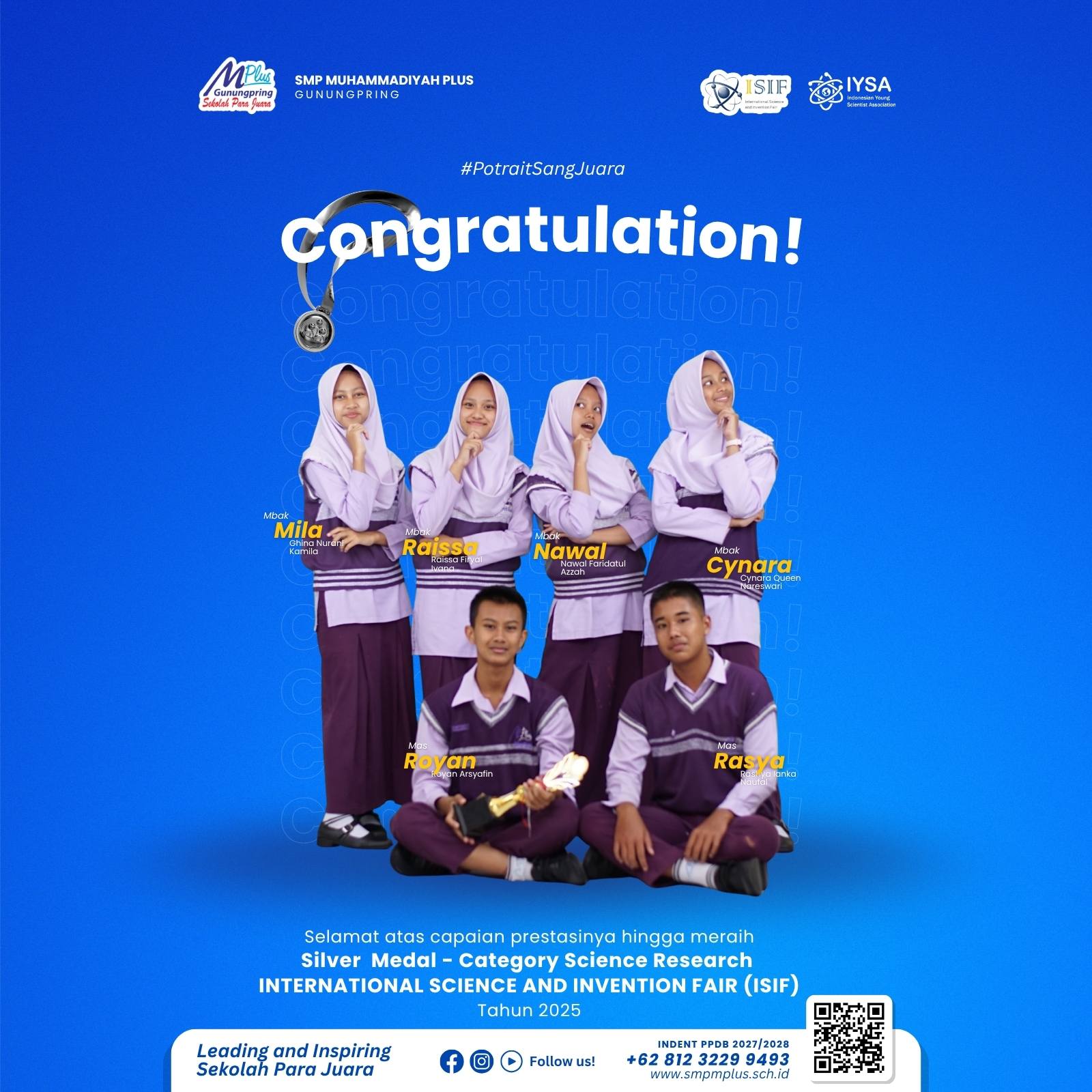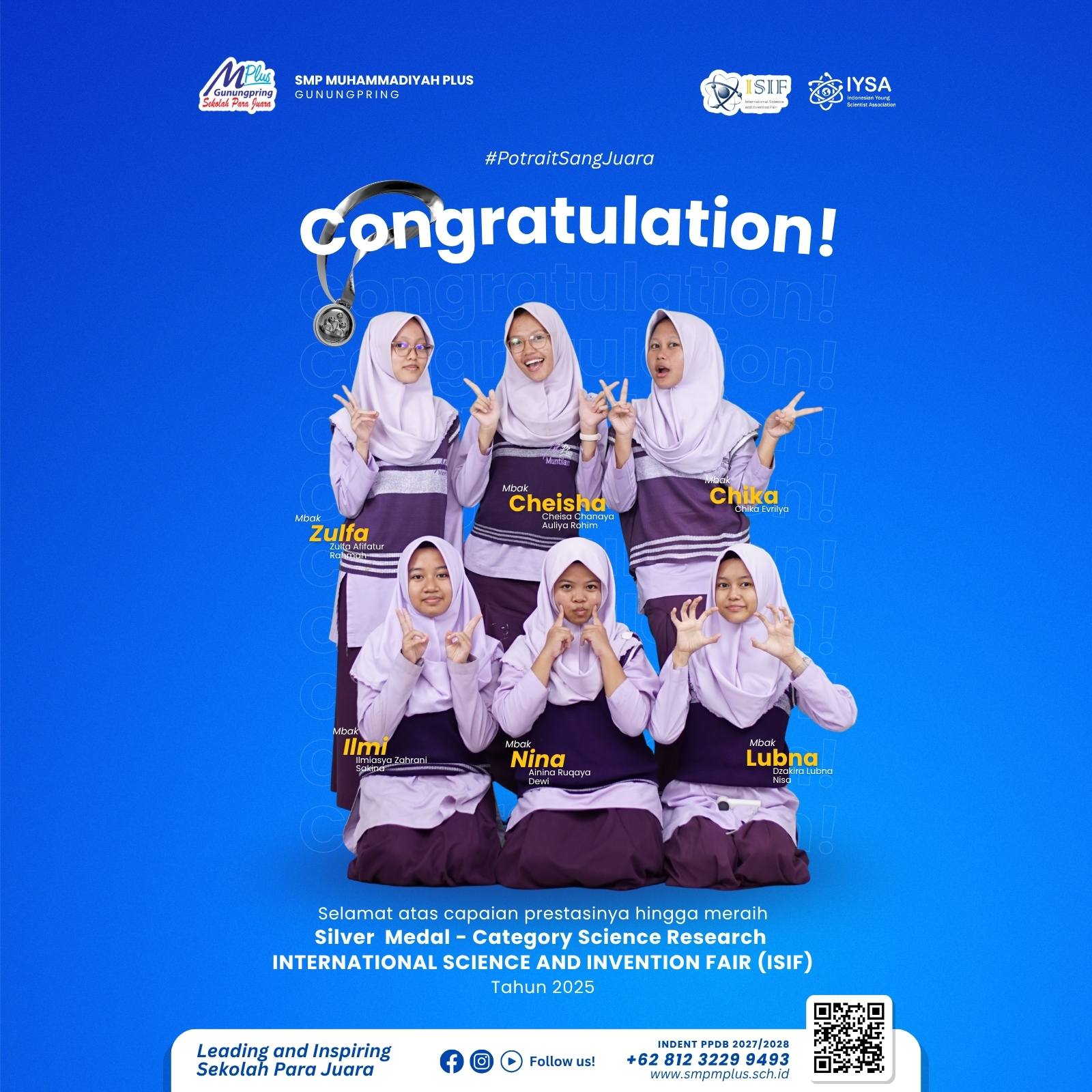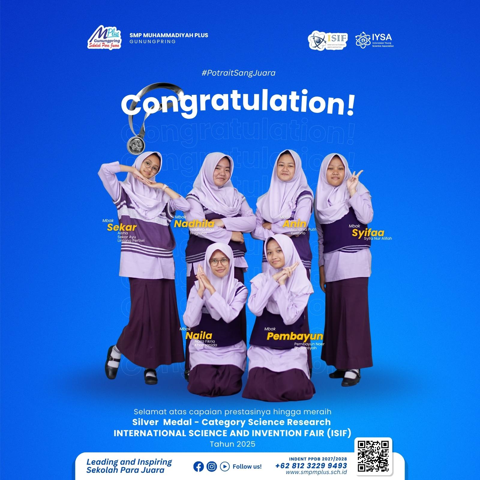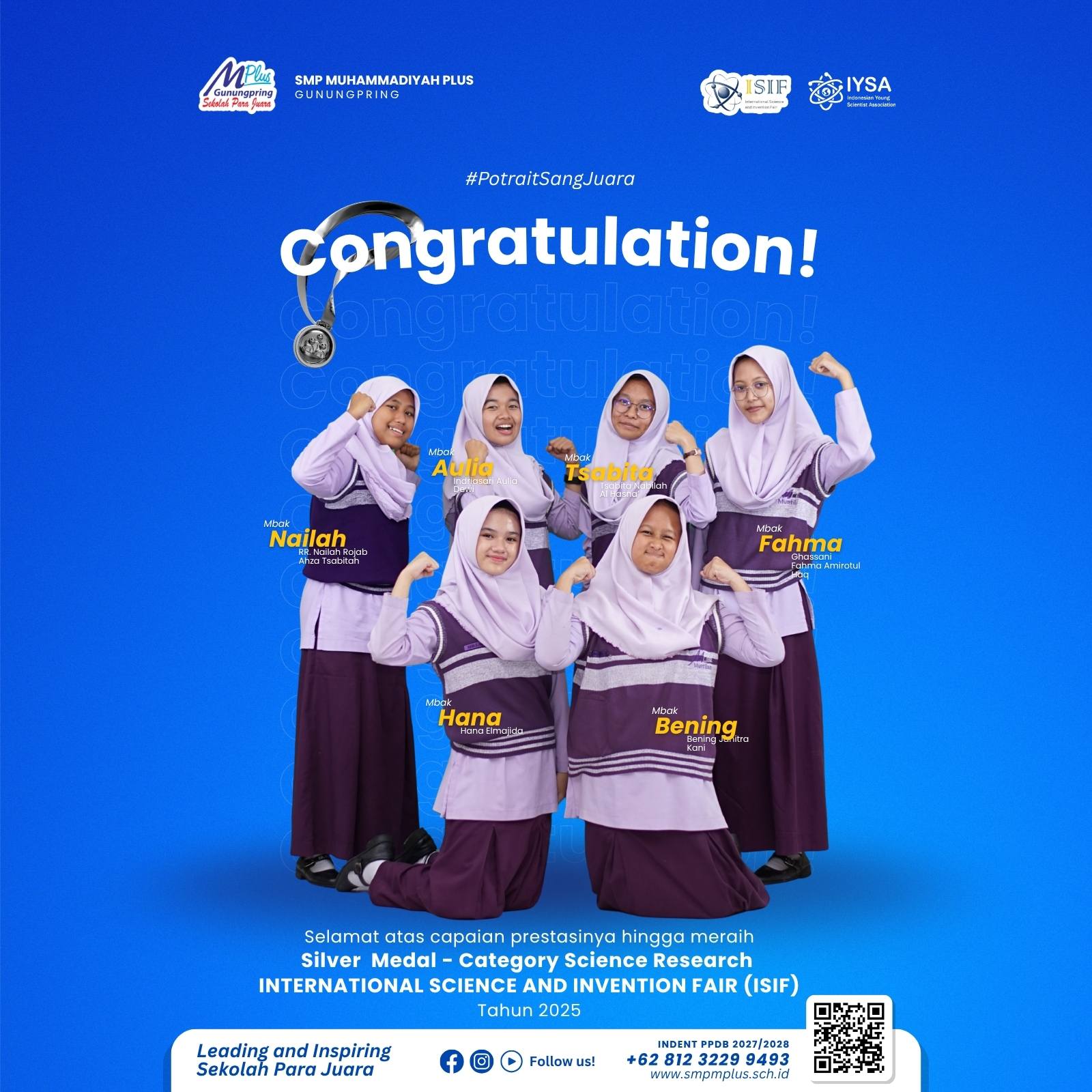 SMP Muhammadiyah Plus (MPlus) Gunungpring kembali membuktikan diri sebagai Sekolah Para Juara. Pada ajang International Science and Invention Fair (ISIF) 2025, para siswa berhasil memborong prestasi bergengsi dalam kompetisi internasional yang diikuti ratusan inovator muda dari berbagai negara.