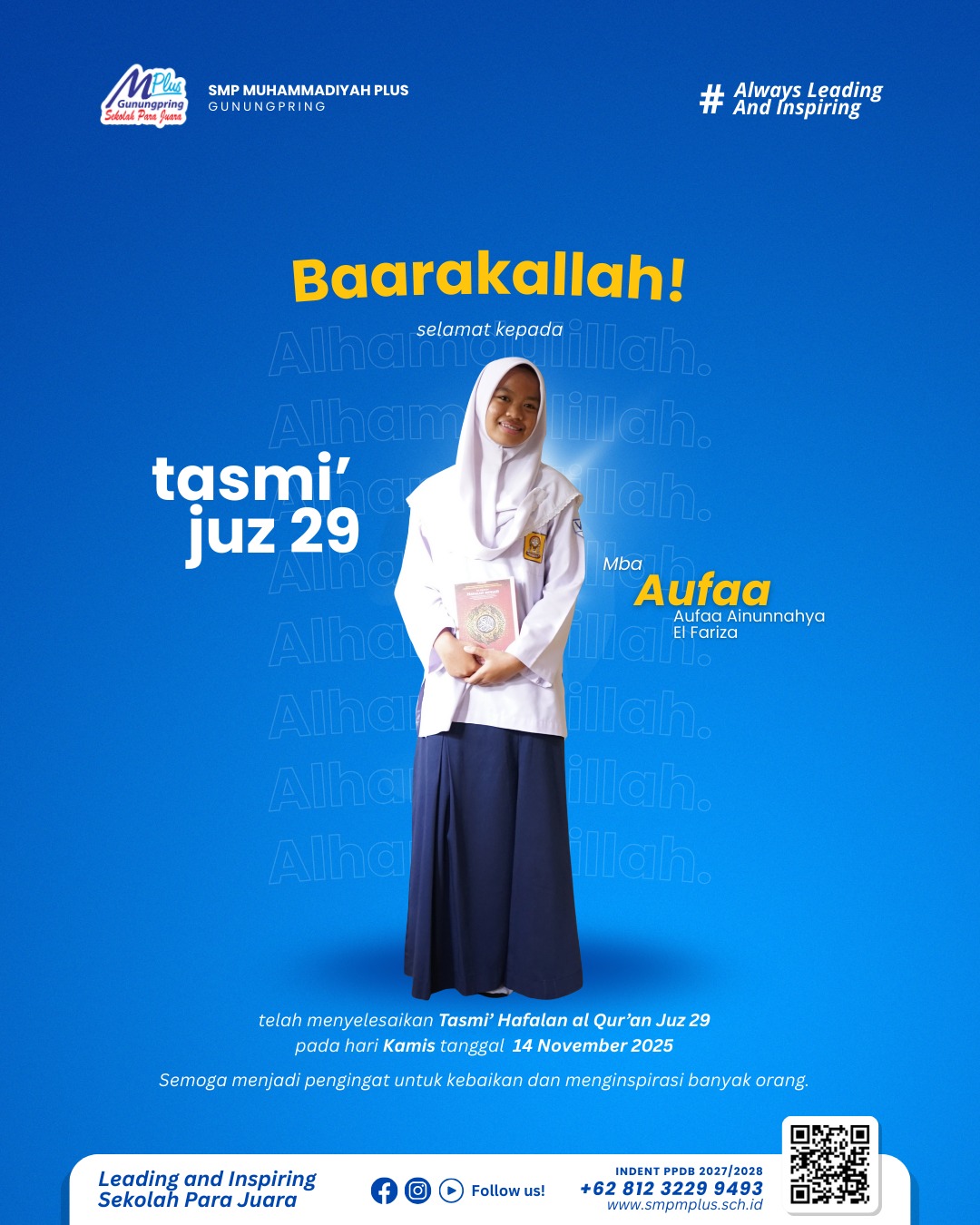 Gunungpring —Suasana haru, bangga, dan penuh syukur menyelimuti keluarga besar SMP Muhammadiyah Plus Gunungpring. Tiga siswa terbaik—Mas Kenneth, Mas Keindra, dan Mba Aufaa—telah menuntaskan Tasmi’ Hafalan Al-Qur’an Juz 29,...