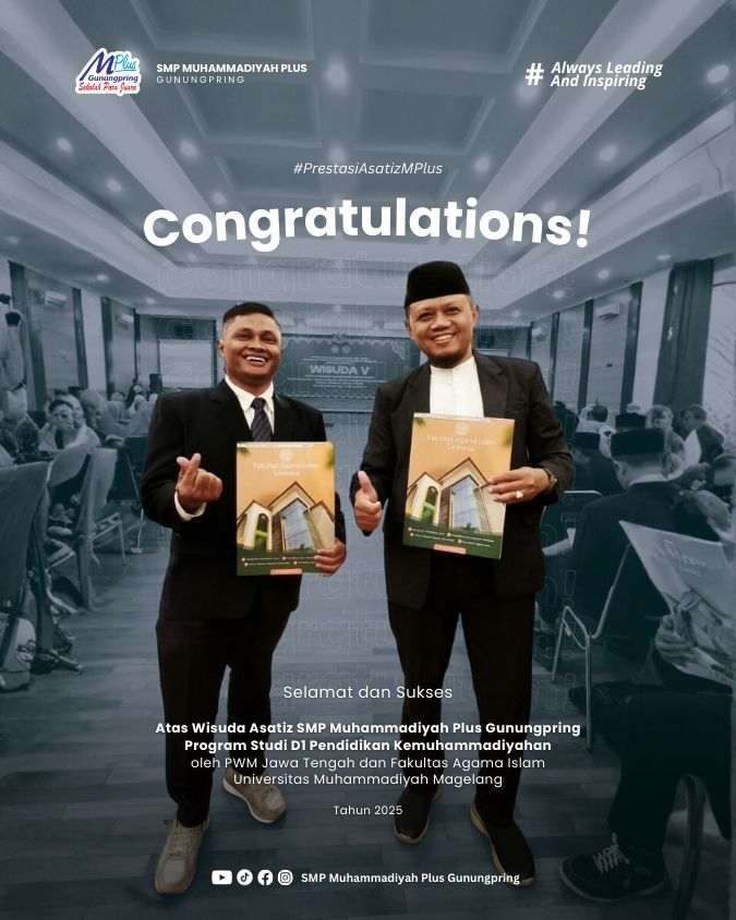 Tahun 2025 menjadi momen membahagiakan bagi keluarga besar MPlus. Dua Asatiz SMP Muhammadiyah Plus Gunungpring resmi mengikuti wisuda Program Studi D1 Pendidikan Kemuhammadiyahan yang diselenggarakan oleh PWM Jawa Tengah bekerja sama dengan Fakultas Agama Islam Universitas Muhammadiyah Magelang. Bagi MPlus, ini bukan sekadar kabar kelulusan. Ini adalah cerita tentang pendidik yang terus mau bertumbuh.