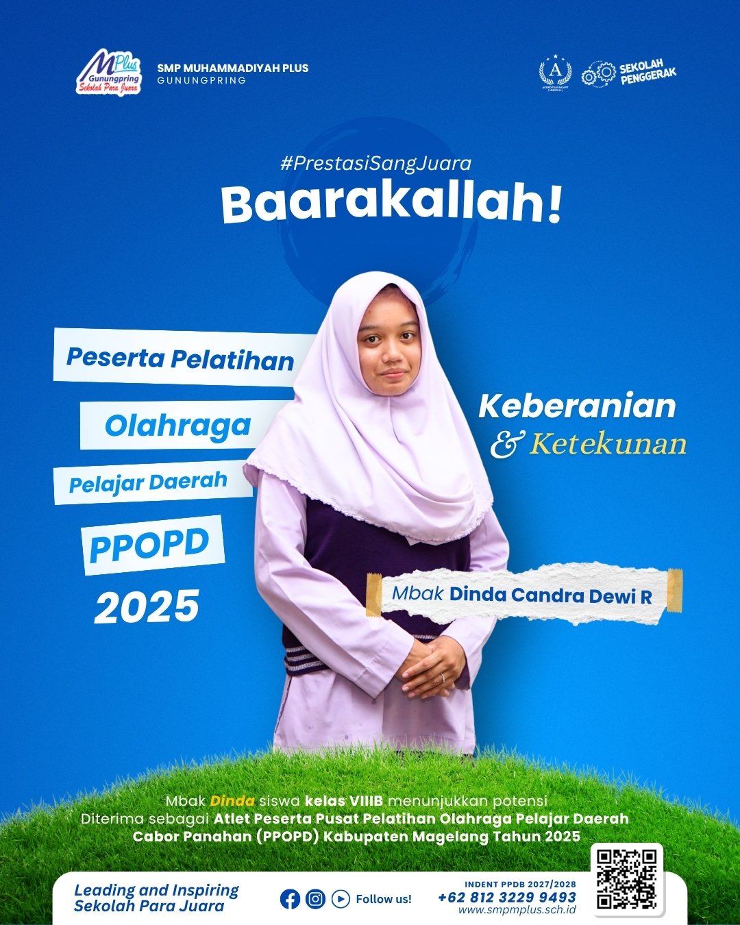 Kalimat itu pas menggambarkan perjalanan dua siswi SMP Muhammadiyah Plus Gunungpring — Mbak Dinda Candra Dewi R (kelas VIIIB) dan Mbak Shelma Fadhilah Carissa (kelas VIIC). Siapa sangka, semangat yang mereka pupuk sejak dini justru mengantarkan keduanya menjadi Atlet Peserta Pusat Pelatihan Olahraga Pelajar Daerah (PPOPD) Kabupaten Magelang Tahun 2025!
