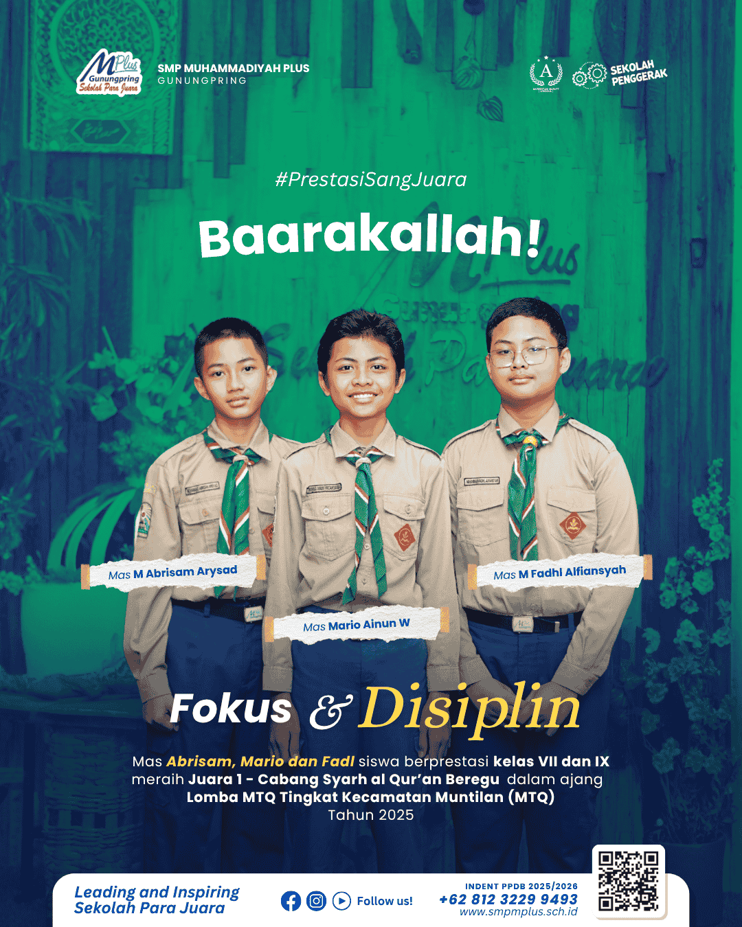 Prestasi demi prestasi ini menjadi bukti nyata bahwa SMP Muhammadiyah Plus Gunungpring bukan sekadar tempat belajar, tetapi wadah pembentukan generasi unggul, berakhlak, dan berprestasi.