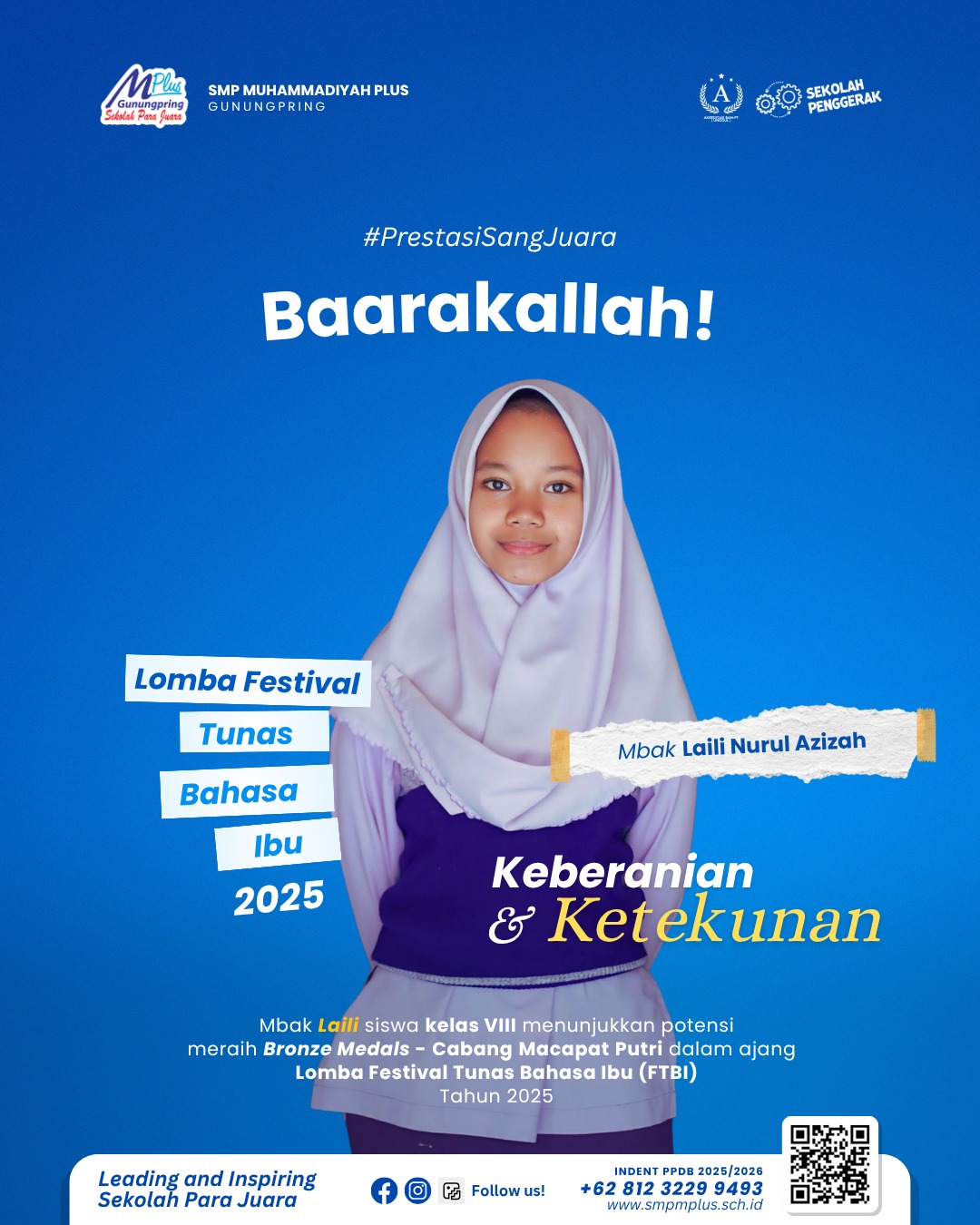 Hal ini terbukti dari prestasi membanggakan dua siswi SMP MPlus, yaitu Yafa Dzakkikiyah Putri dan Laili Nurul Azizah, yang berhasil meraih medali perunggu di ajang Festival Tunas Bahasa Ibu (FTBI) 2025.