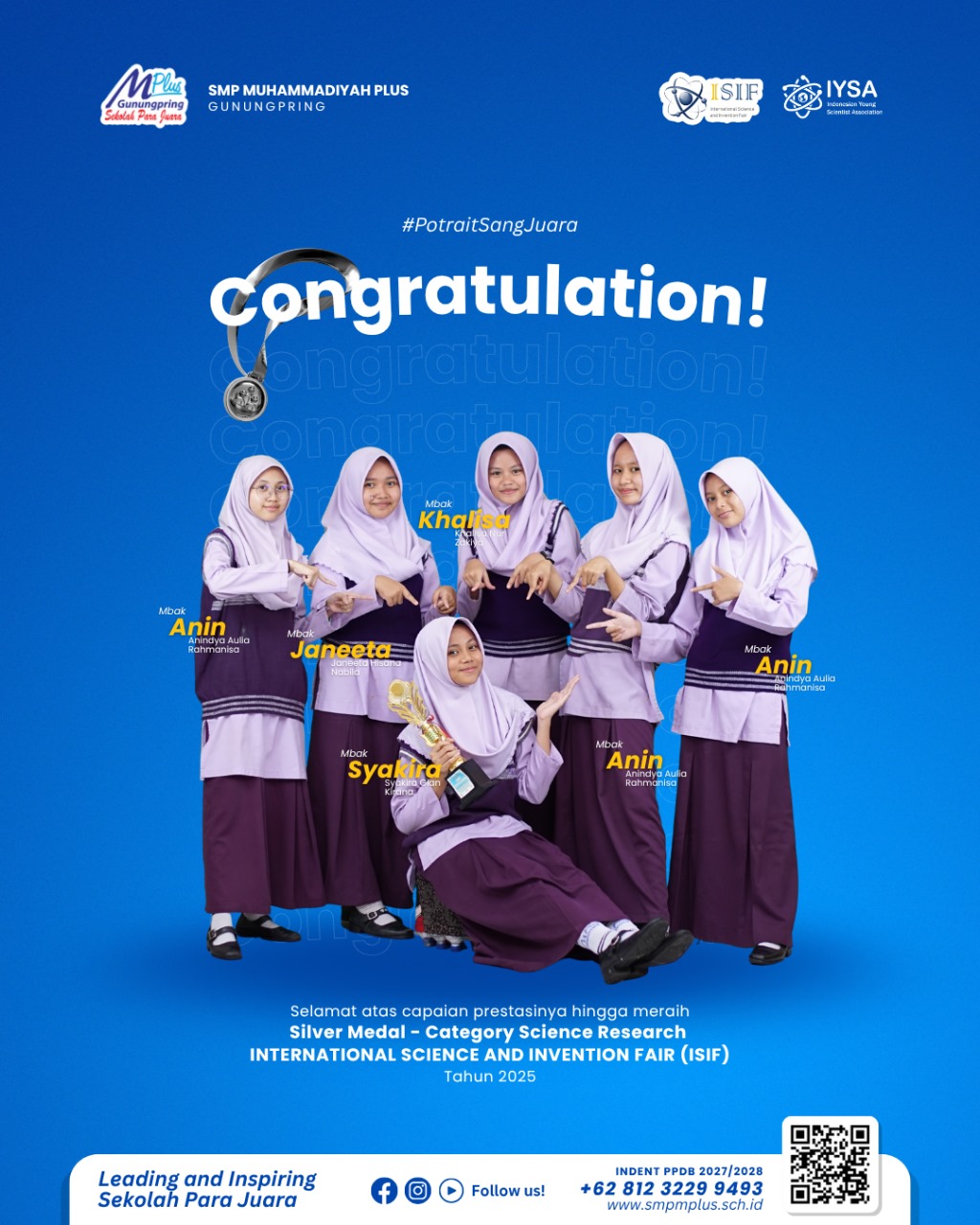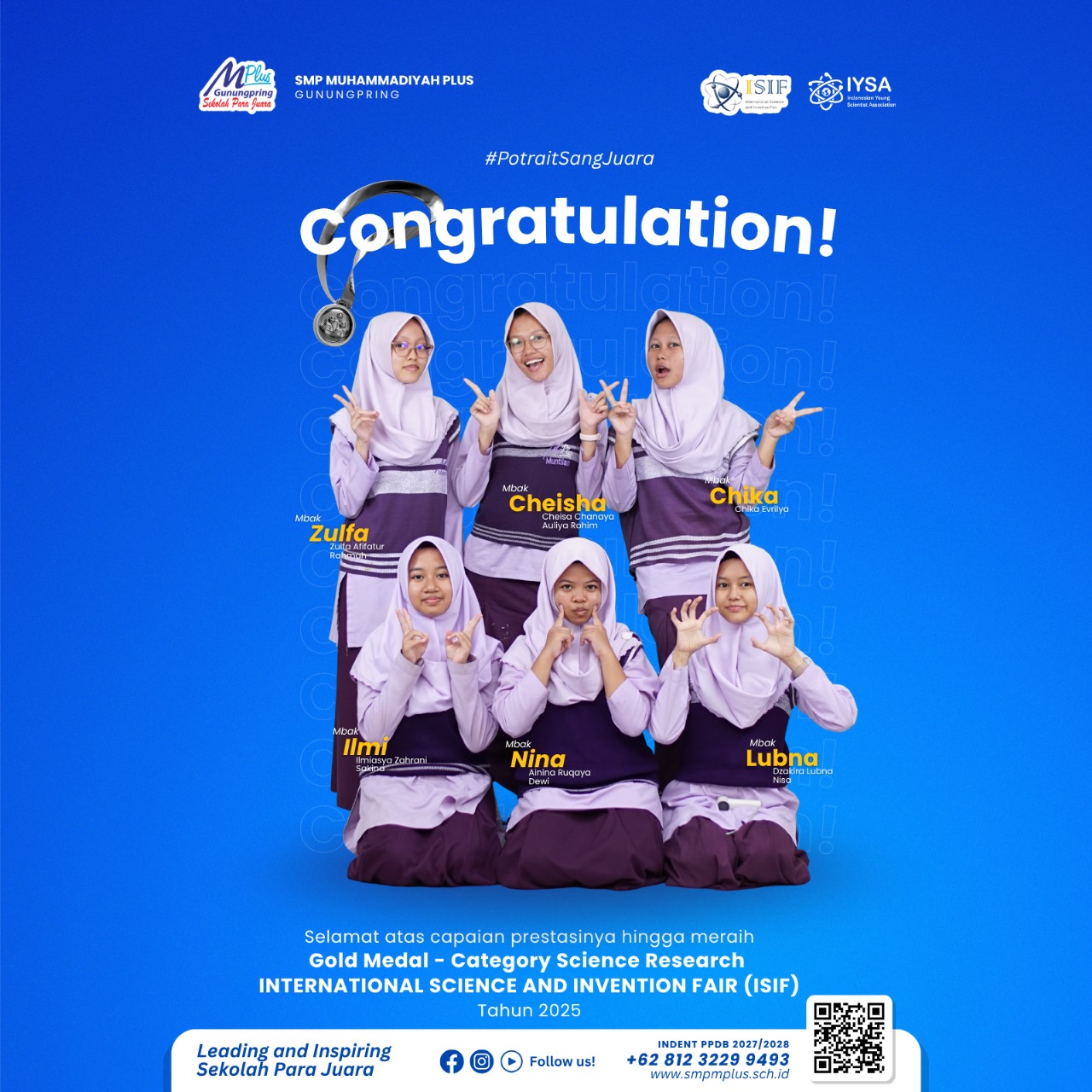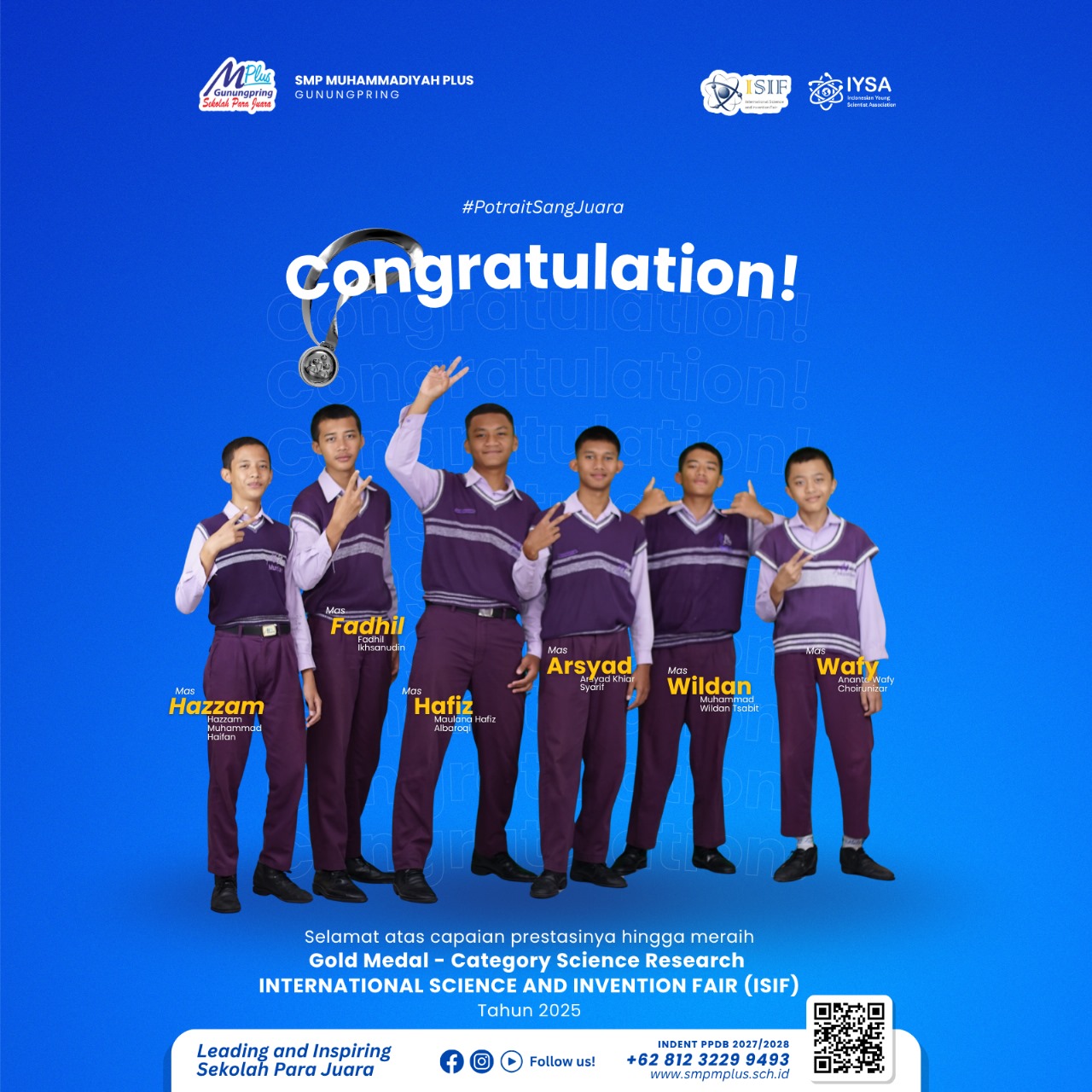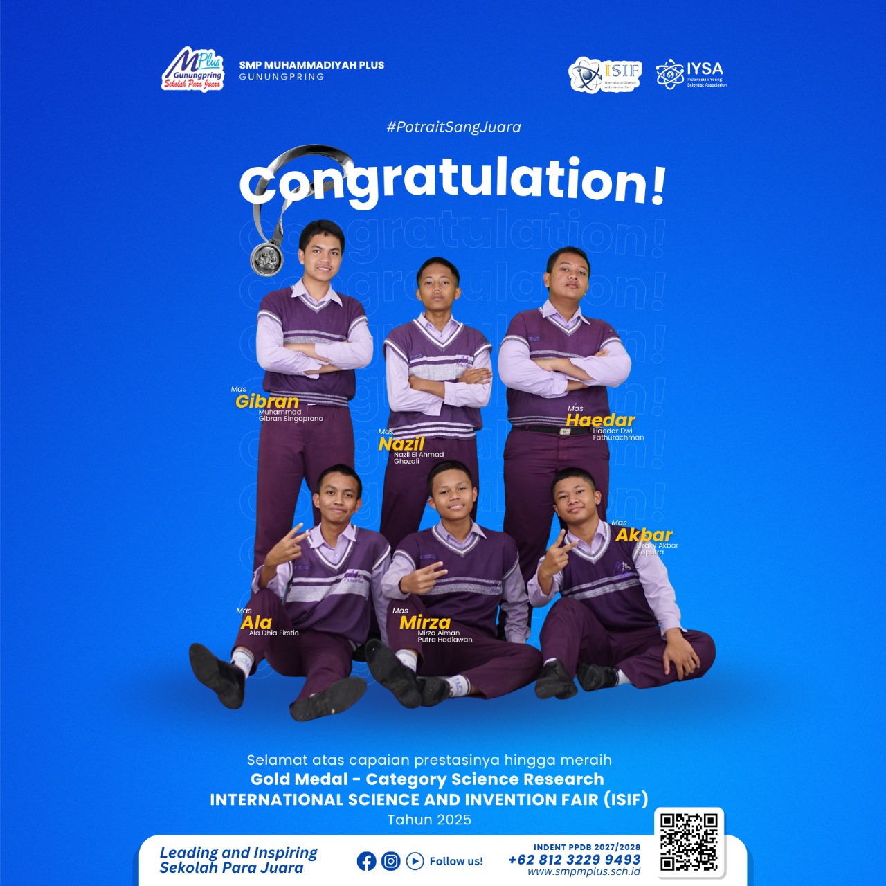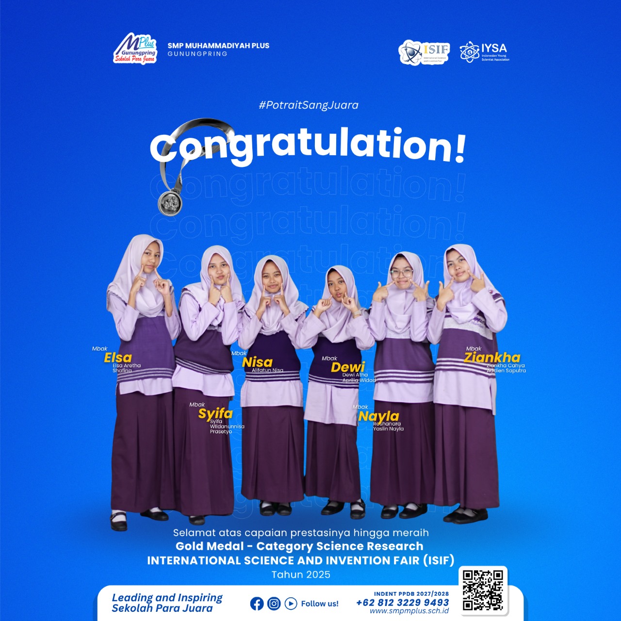 SMP Muhammadiyah Plus (MPlus) Gunungpring kembali membuktikan diri sebagai Sekolah Para Juara. Pada ajang International Science and Invention Fair (ISIF) 2025, para siswa berhasil memborong prestasi bergengsi dalam kompetisi internasional yang diikuti ratusan inovator muda dari berbagai negara.