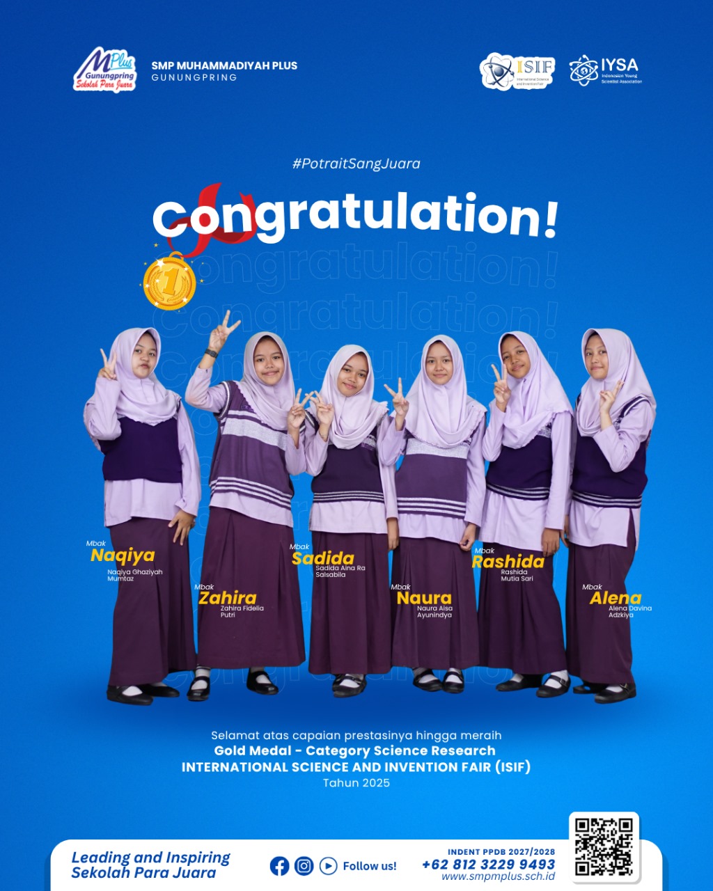 SMP Muhammadiyah Plus (MPlus) Gunungpring kembali membuktikan diri sebagai Sekolah Para Juara. Pada ajang International Science and Invention Fair (ISIF) 2025, para siswa berhasil memborong prestasi bergengsi dalam kompetisi internasional yang diikuti ratusan inovator muda dari berbagai negara.